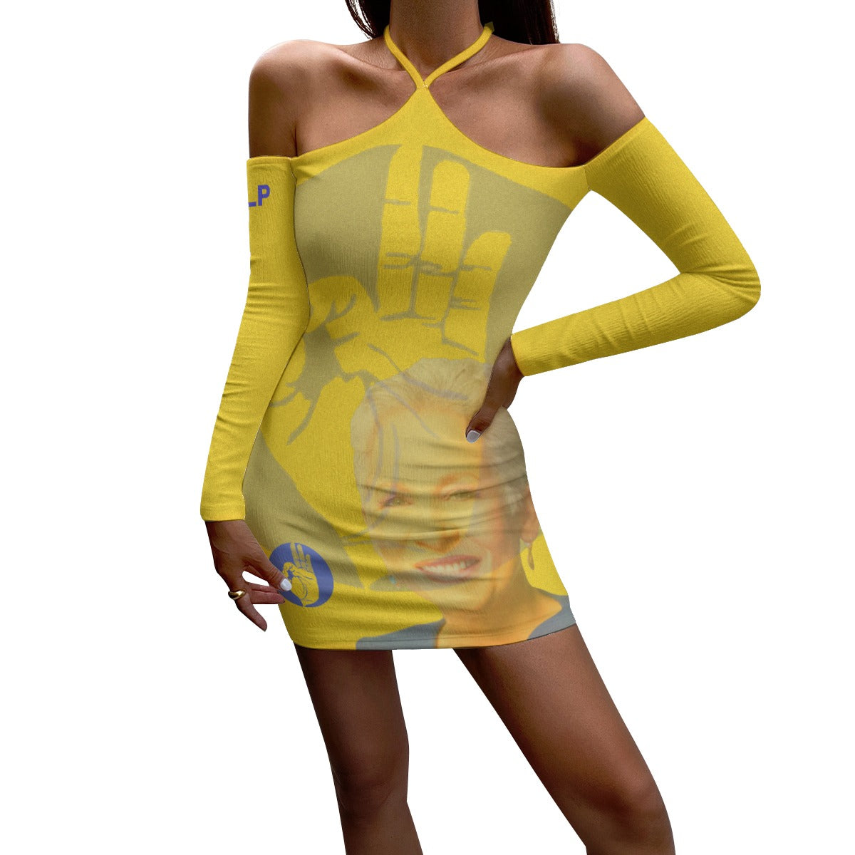Dress features a cropped cut, off the shoulder detail with long sleeves, a halterneck, stretch and lined.It's a sexy women's dress