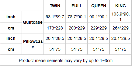inch | Quiltcase | 68.1*89.7 | 78.7*90.1 | 90.1*90.1 | 103.9*90.1 |